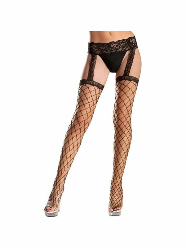 Black sheer fishnet thigh highs with lace garter belt.