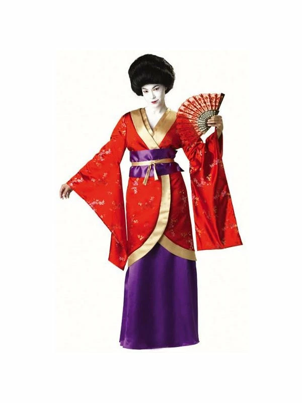 This Japanese Geisha includes a satin under-gown, Japanese floral brocade satin top coat with drop sleeves, waist sash and lace fan. Black wig not included.
