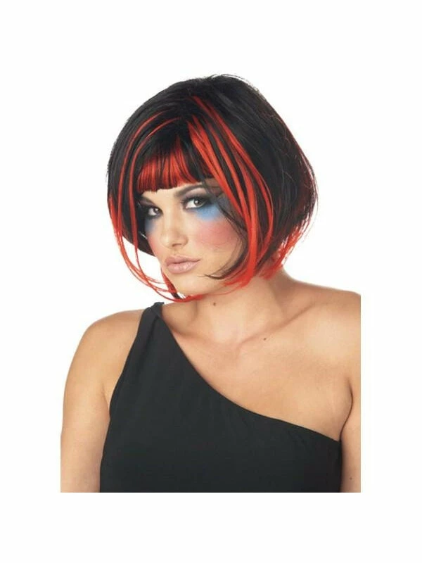 Our women’s black and red party girl wig is a great wig to wear to any rave Halloween party.