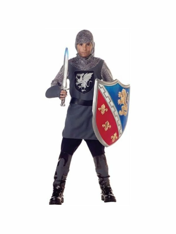 This valiant knight is wearing a poly and metallic lurex tunic with screen printing, a character hood, gloves and boot covers.