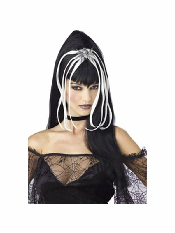 Our women’s black widow wig with white highlights is the ideal gothic costume wig. Wear it by itself or add it to any of our gothic styled costumes.