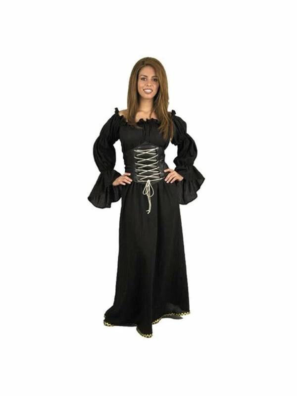 Our Adult Gypsy Fortune Teller costume features a gauze dress & faux leather corset.