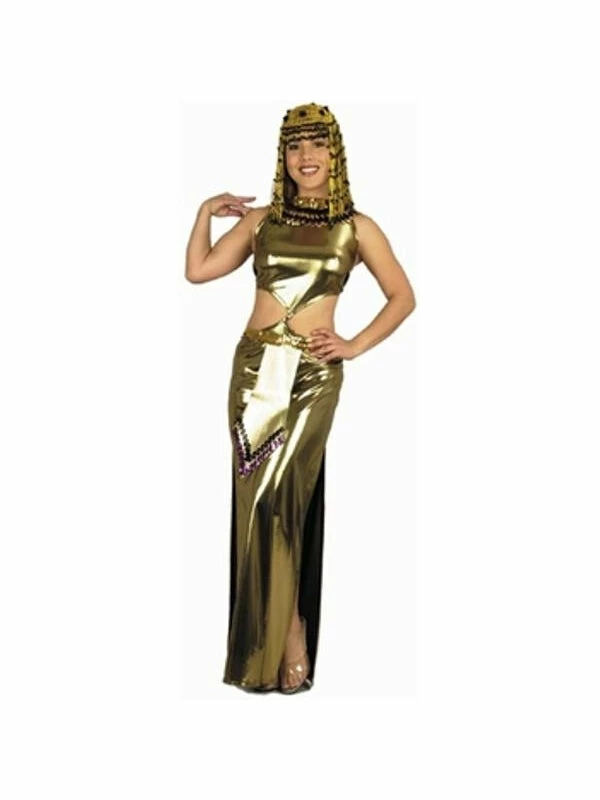 Our Adult Cleopatra Costume features a gold lame mid drift top with full length slit skirt, sequin collar, headband & belt.