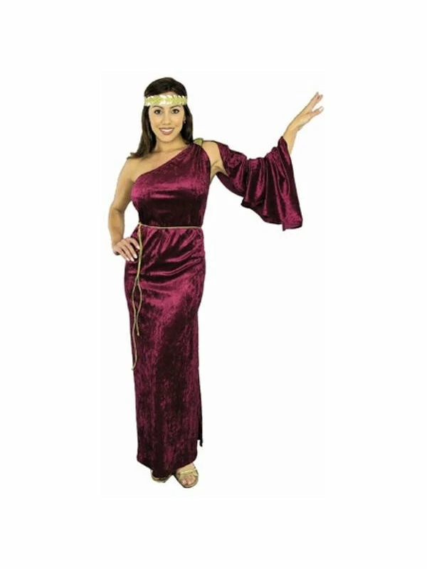 Our Adult Roman Goddess Costume features a crushed panne dress, gold tie cord & headband.