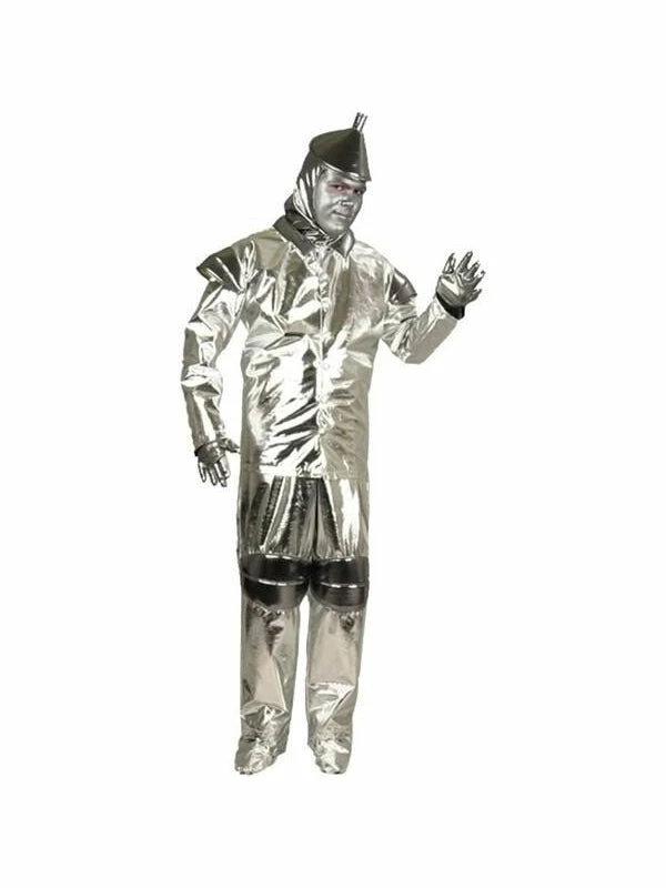Our Adult Tin Man costume features a jacket, pants, shoe covers and hat. Fabric detail may vary.
