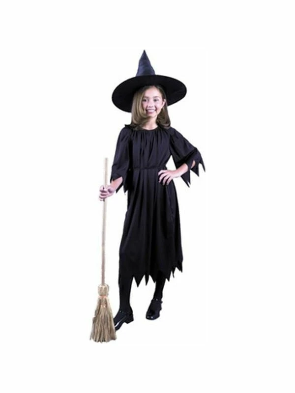 Our kid’s Black Witch costume features a poly or panne fabric witch dress with waist tie cord. Hat not included.
