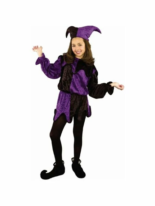 This child’s jester costume includes a 3/4 length panne jester tunic with a matching stuffed hat. Shoes not included.