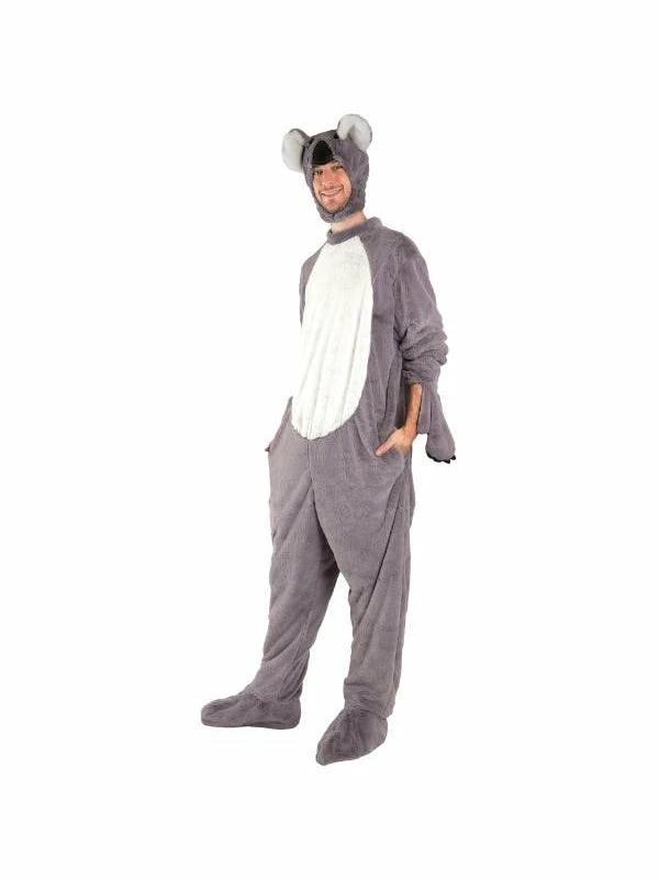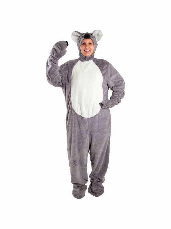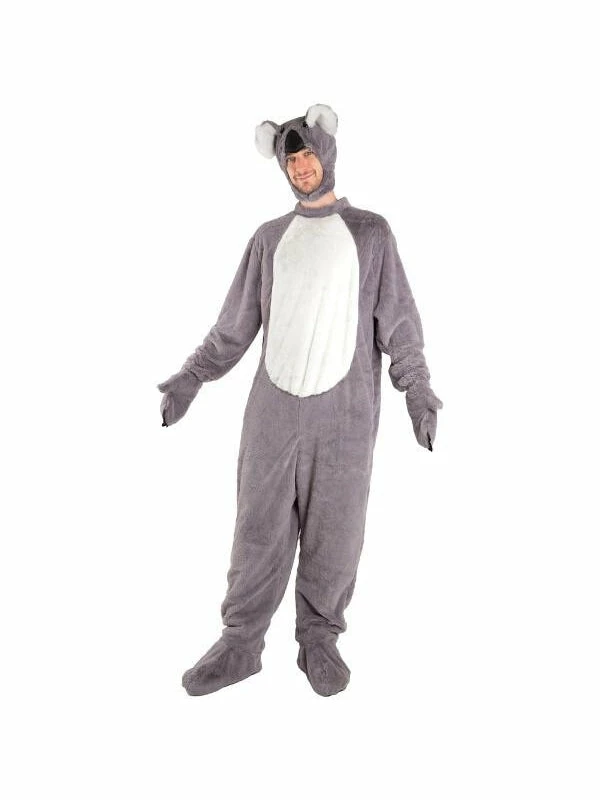 This Koala Bear costume features a soft grey fur bodysuit with a white fur tummy, and attached gloves. The matching character headpiece is fur lined, and features soft cute ears, black bead eyes, and a pleather nose.