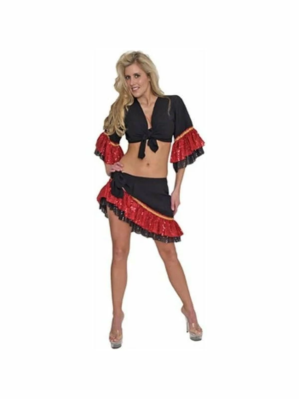 Our sexy Latin dancer costume includes a tie fron crop top, side mini skirt and sparkly sequin details.