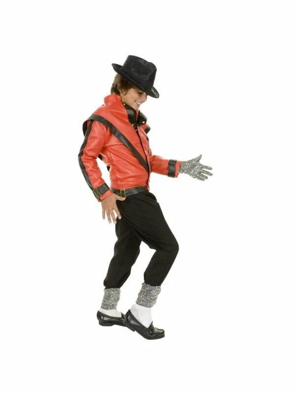 This pleather jacket features red fabric with black stripes for an authentic 1980’s pop star look.