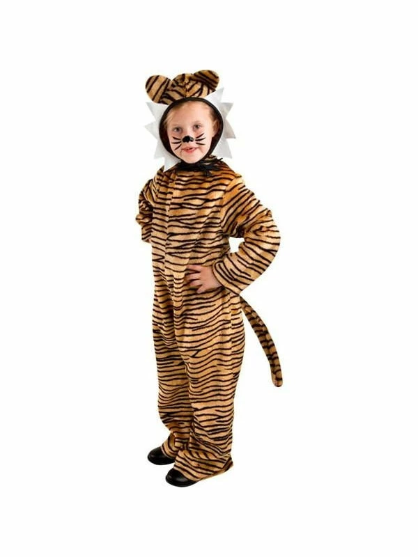 Our orange and black tiger costume is the perfect big cat costume for Halloween. Costume features tiger pattern fabric on its jumpsuit and headpiece.