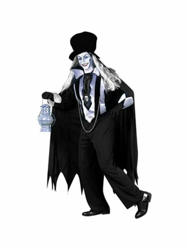 This quality Mr. Hyde costume is a little on the darker side. It includes a hat with attached hair, cape, vest and gloves.