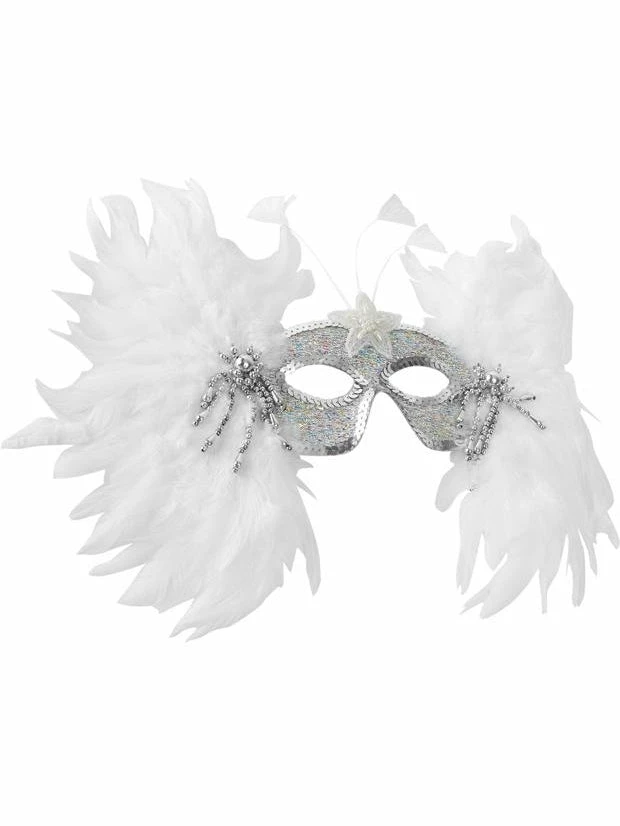 Snow Flake feather eye mask with white feathers highlighted with silver sequin eye trim. 3 small feathered plumes rising from the center of the mask.