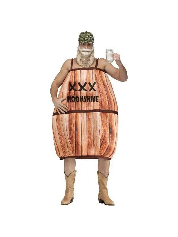 This costume features a barrel themed tunic, a redneck hat, and a character beard.