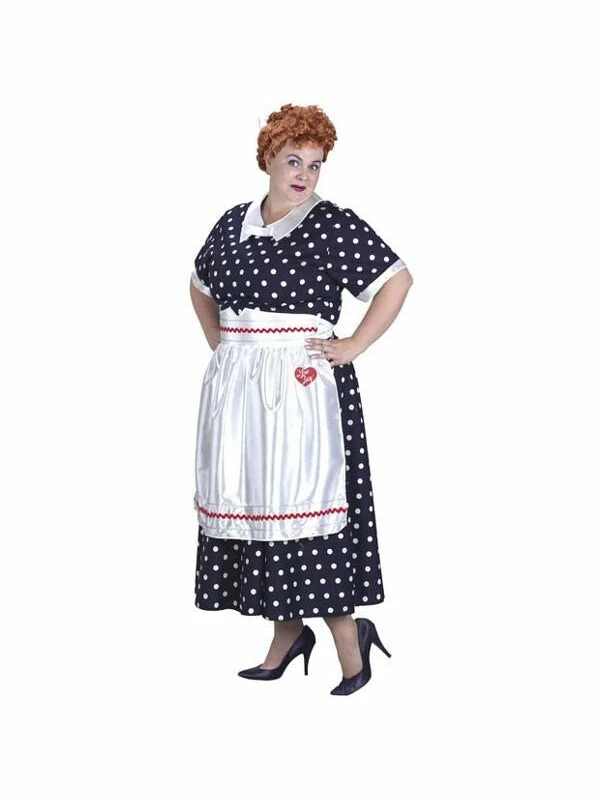 Plus Size I Love Lucy Polka Dot Dress. This costume includes a satin polka dot dress, an apron trimmed in ric rac with imprinted insignia and a stain hair bow. The wig is sold separately.