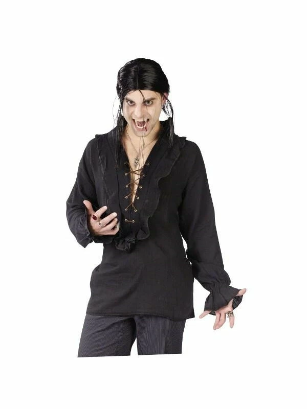 This Vampire shirt features ruffled edges, and a front lace up design.