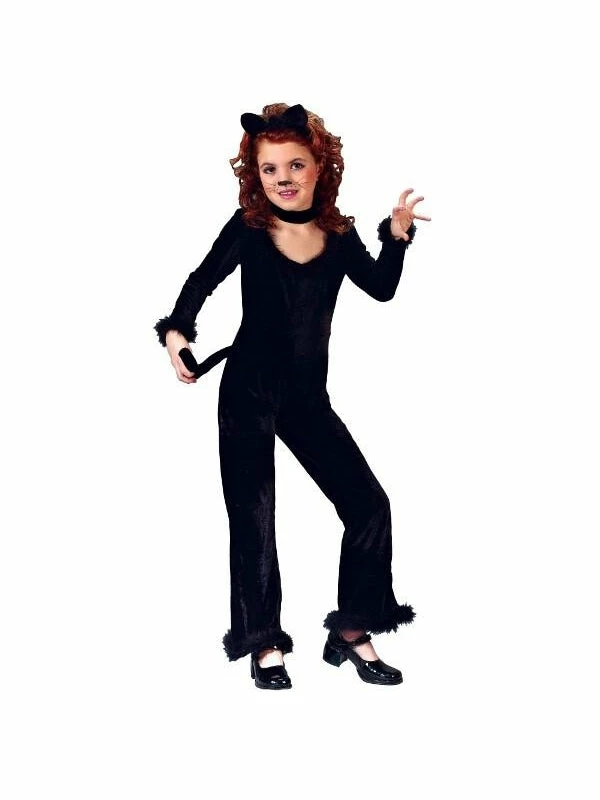 This child version of the Playful Kitty costume features a black cat jumpsuit, with marabou trim, and an attached tail. A headband with cute cat ears is also included to complete the look.