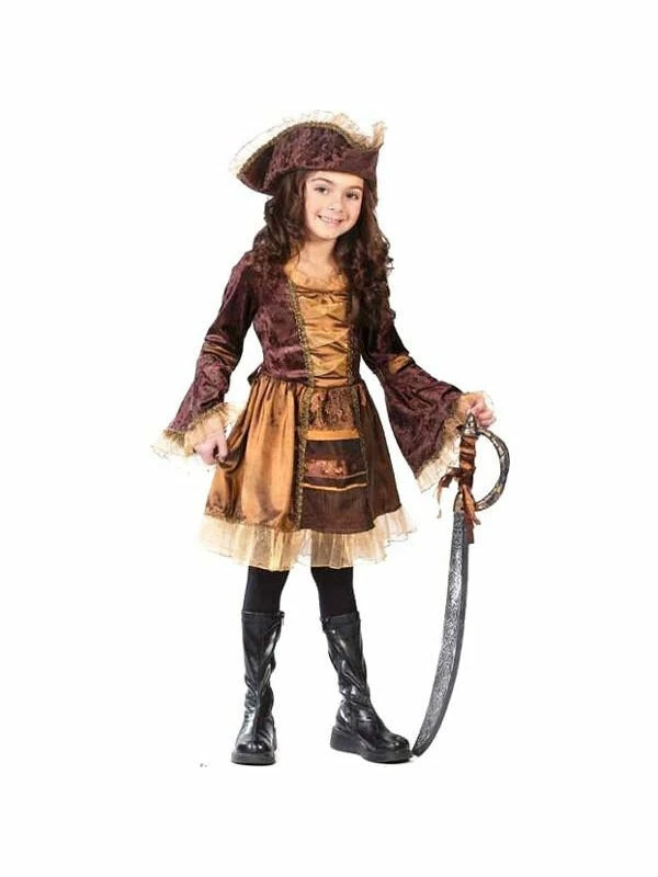 Our kid’s sassy Victorian pirate girl dress is a nice girl’s pirate Halloween costume.