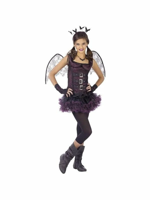 This teen size Night Wing Bat costume features a black and purple dress with a ruffle tutu skirt, glovelettes, character wings, and a matching headband with bats.