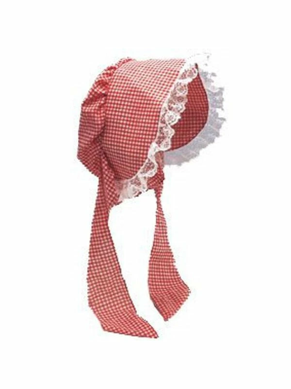 Complete your colonial costume with one of our red and white bonnets with white lace trim. This hat is perfect for any colonial play or early American costume.