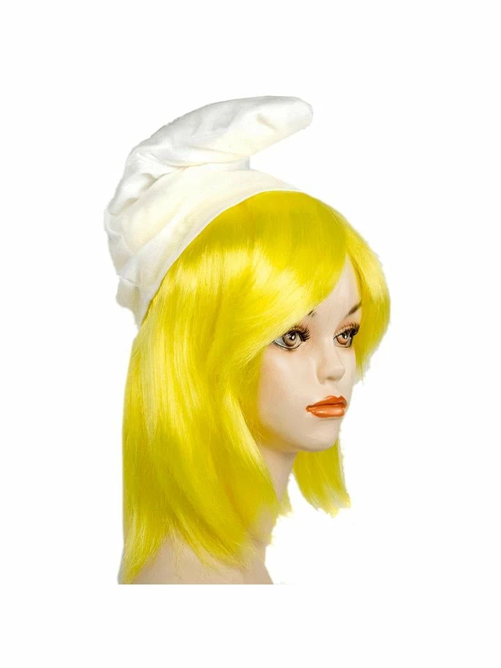 This long, yellow wig features an attached white cap. The longest strands of synthetic hair are approximately 16″ long.