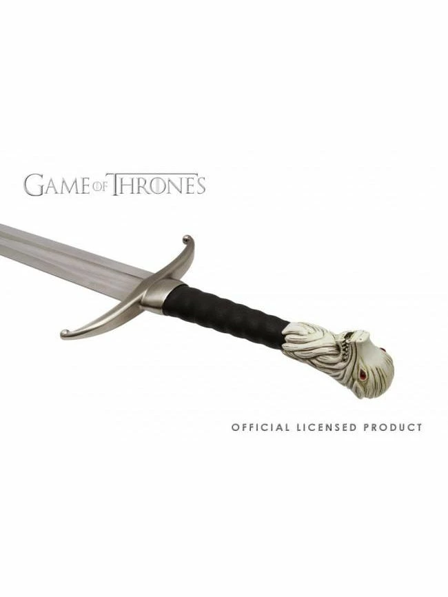 Now you can own this beautifully crafted replica of Jon Snow’s prop from your favorite HBO hit series Game of Thrones. The 35 inch blade is made from polished stainless steel, while the hilt is made with genuine leather. The pommel features an antique metal wolf with exquisite details, and red jeweled eyes.