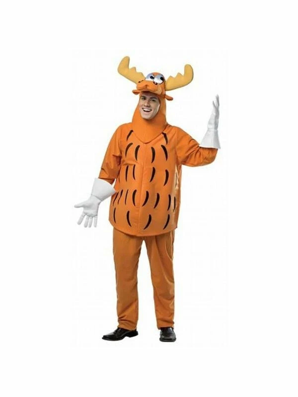 The adult Bullwinkle costume features a character shirt, matching pants, white gloves, and a character headpiece.