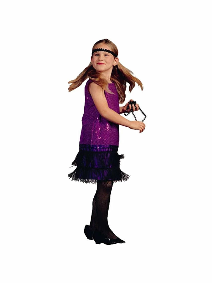 This flapper girl costume includes a purple flapper dress and a matching headband.