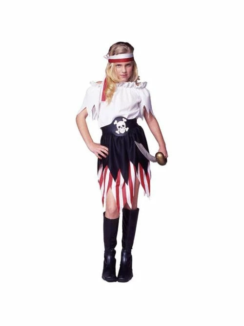 Our child’s pirate wench costume includes a shirt, skirt, vest, vinyl belt and headband.