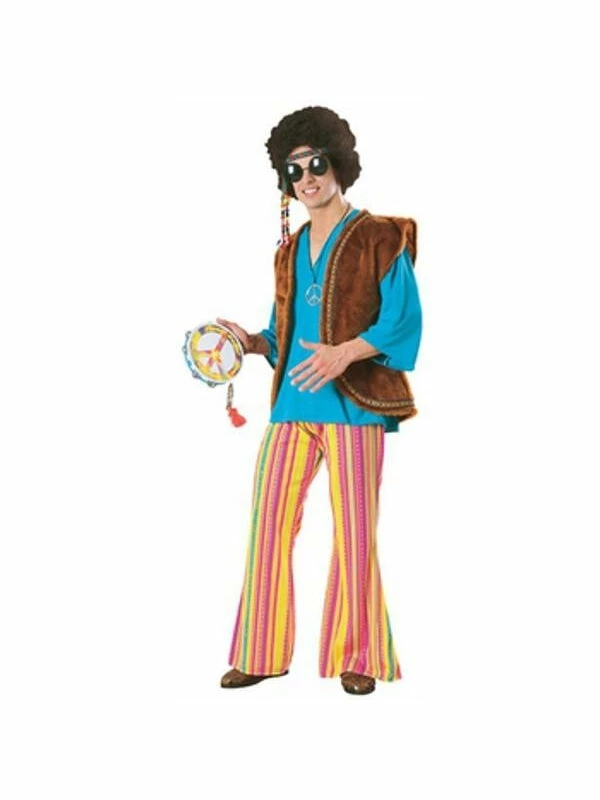 Are you ready to change the world with peace, love, and rock and roll? Lay back and enjoy a ripping Jimi Hendrix guitar solo or get lost in the soft cooing melodies of Vashti Bunyan as you dream of a better tomorrow in this costume. Our adult hippie costume has a sky blue shirt with attached faux-leather vest and the grooviest striped pants you ever saw. Far out!