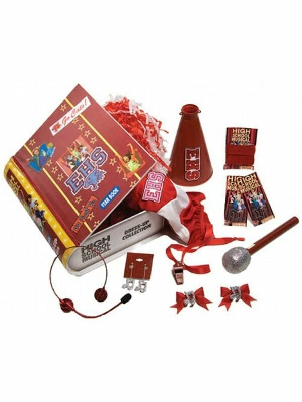 This 21 piece High School Musical costume set comes in a faux yearbook for storage. It is one size fits most kids chest size 26-34″, waist 24-32″, hips 26-36″.