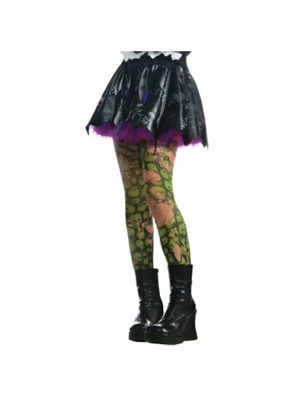 Your legs might get cold in the zombie apocalypse, so be sure to wear lots of layers. These tights have green skulls and lots of tatters to complete your zombie look.