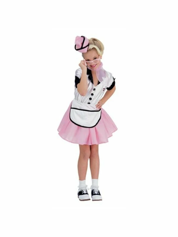 Our child’s soda pop girl costume is a cute, retro costume that looks just like a pink 50’s waitress outfit from the good old days.