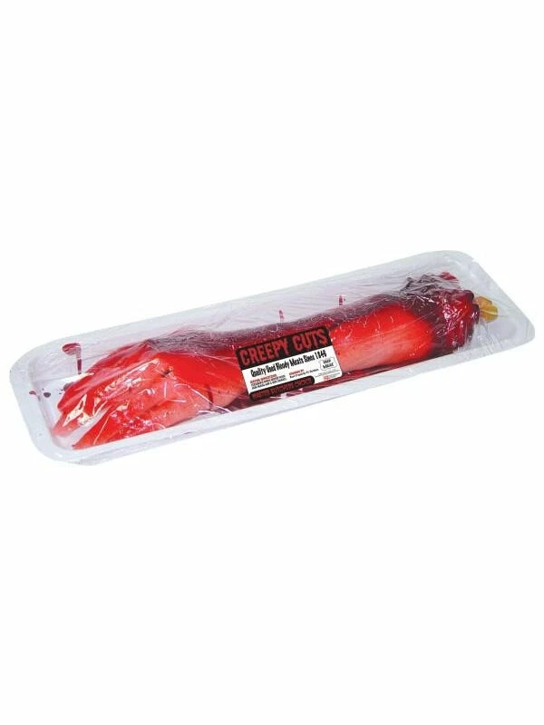 Gruesomely packaged like ground beef at the meat counter, this “severed arm” Halloween prop should turn the stomach of any guests this October.