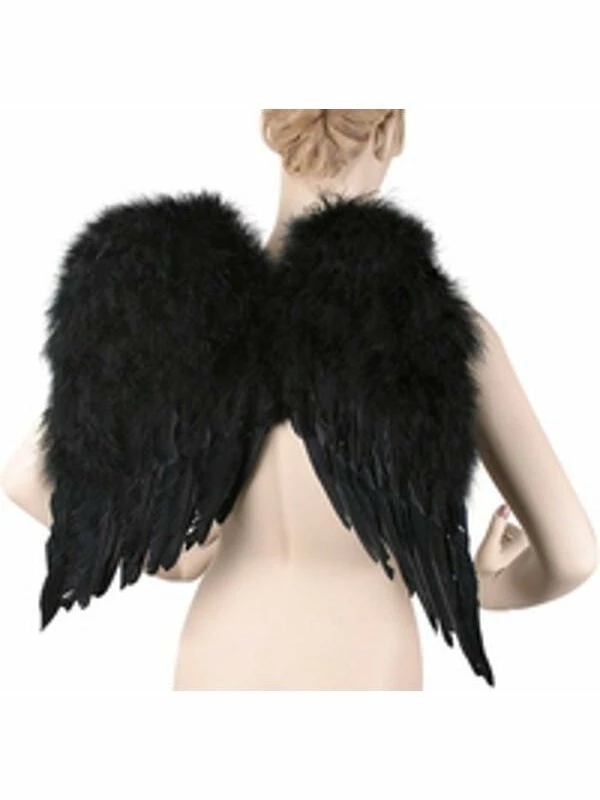 Black Feathered Angel Costume Wings are made of real feathers and heavy duty cardboard. Black Elastic shoulder straps.