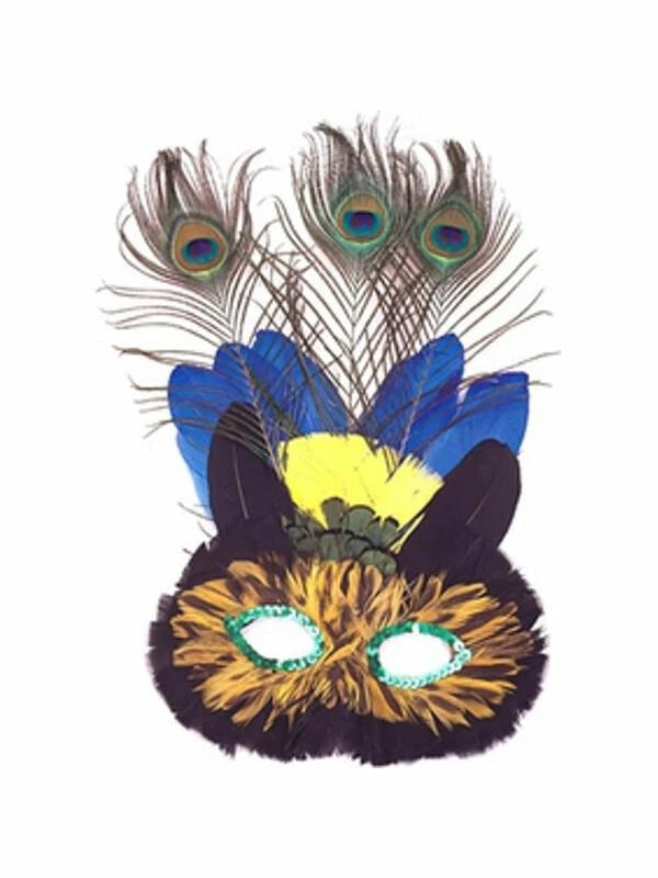 Colorful cat eye mask with peacock feather accents.