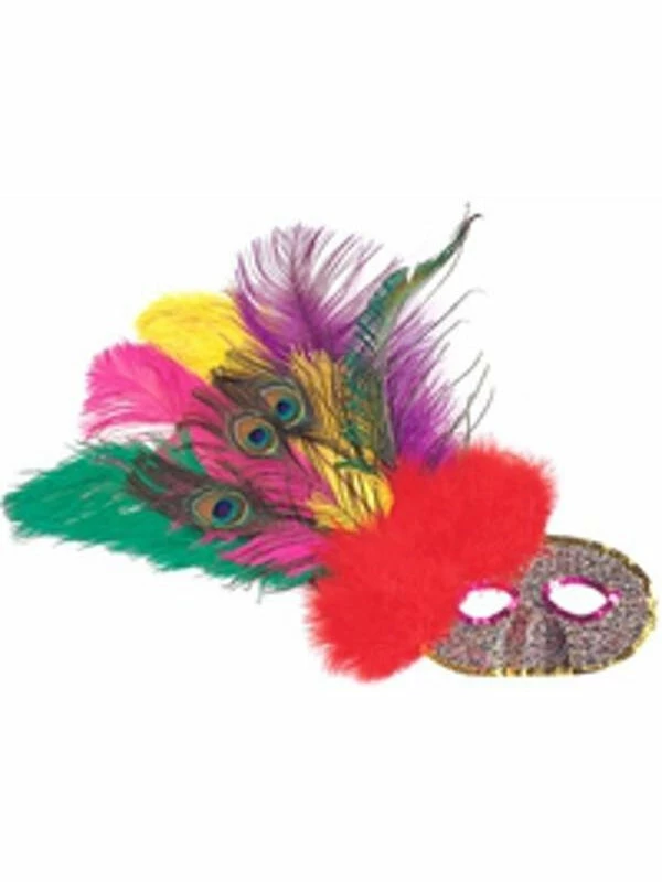 Side feather party eye mask with peacock feather accents and colorful sequin trim.